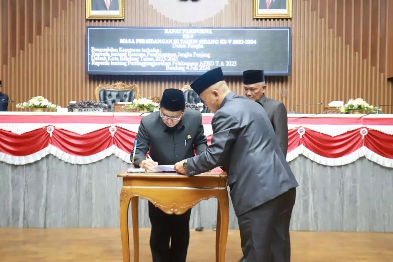 Seusai disetujui forum rapat paripurna, dilakukan penandatanganan Keputusan DPRD dan Berita Acara Persetujuan bersama atas penetapan dua raperda tersebut oleh Pimpinan DPRD Kota Bandung dan Pj. Wali Kota Bandung.
