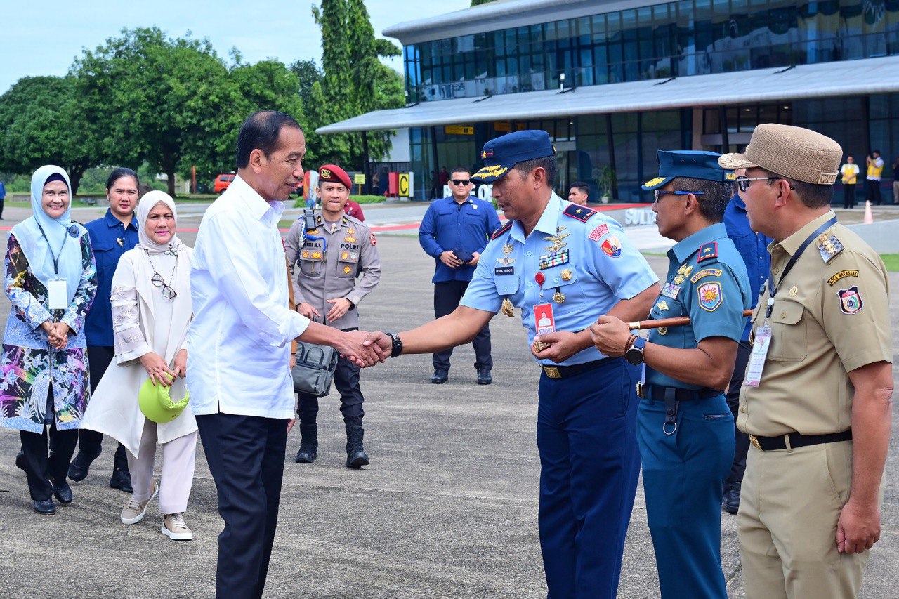 REPORTASEJABAR.COM -Makassar – Danlanud Sultan Hasanuddin Marsma TNI Bonang Bayuaji G,S.E., M.M., menyambut kedatangan Presiden Republik Indonesia, Ir. Joko Widodo didampingi Ibu Iriana Joko Widodo, bertempat di Apron Baseops Lanud Sultan Hasanuddin, Makassar, Sulawesi Selatan, Kamis (4/7/2024).
