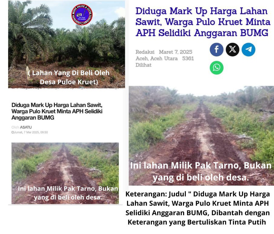 REPORTASEJABAR.COM -Puloe Kruet, Aceh, Sabtu 8 Maret 2025 – Pemberitaan beberapa media online terkait dugaan mark-up harga pembelian kebun untuk Badan Usaha Milik Gampong (BUMG) Desa Puloe Kruet mendapat bantahan keras dari Keuchik Hendra Sulaiman dan Ketua BUMG Abdul Rafa. Informasi awal yang diperoleh GMOCT dari media online Bongkarperkara (anggota GMOCT) menyebutkan adanya tudingan mark-up dan proses pembelian yang tidak sesuai musyawarah. Tudingan tersebut diduga dilontarkan oleh warga desa yang pernah mencalonkan diri sebagai kepala desa.