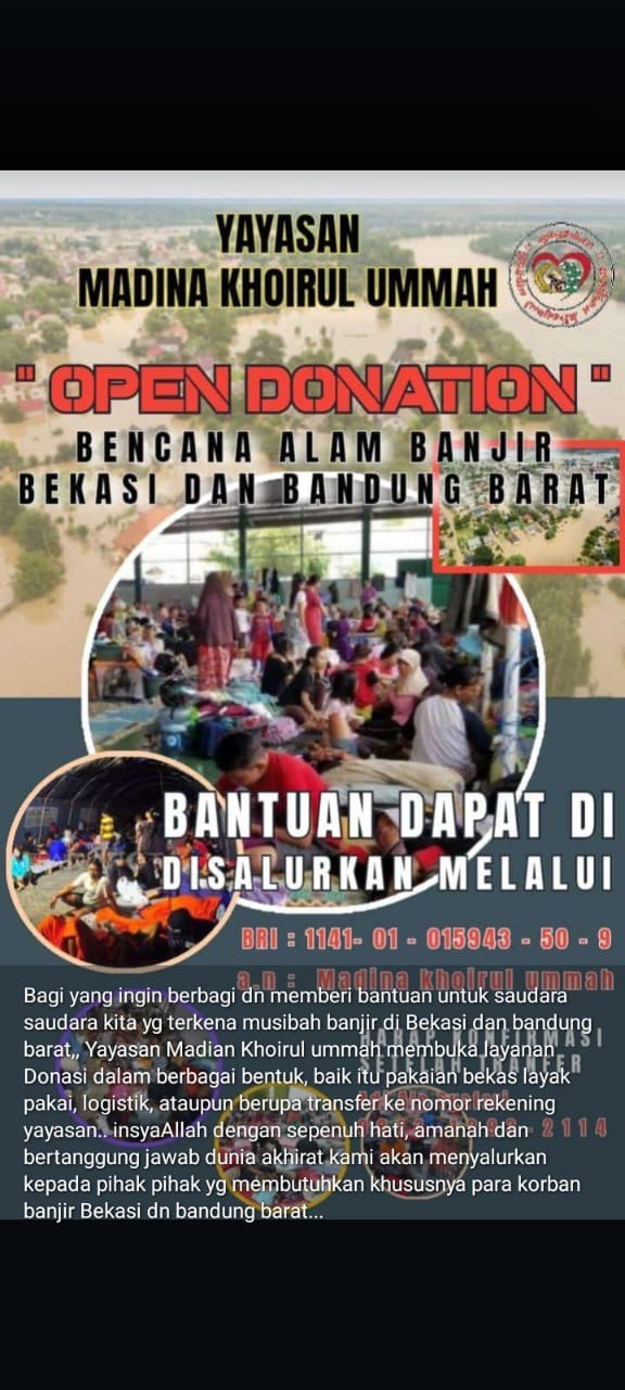REPORTASEJABAR.COM -Bandung, 16 Maret 2025 – Yayasan Madina Khoirul Ummah membuka penggalangan dana atau donasi untuk membantu para korban bencana alam banjir yang melanda wilayah Bekasi dan Bandung Barat. Banjir yang terjadi telah menyebabkan kerugian materiil dan menimbulkan penderitaan bagi banyak warga.