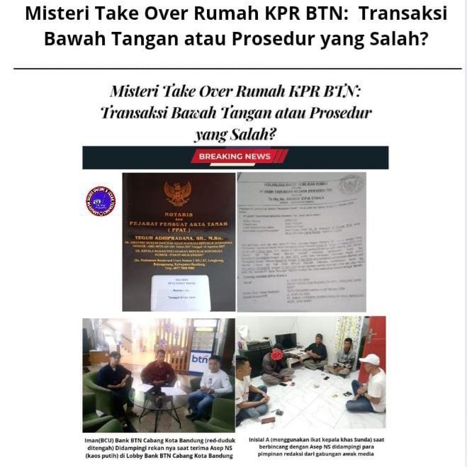 REPORTASEJABAR.COM -Bandung, 19 Maret 2025 – Telah tayang sebelum nya pada tanggal 26 Februari 2025 perihal Kasus take over rumah KPR BTN di Bumi Parahyangan Kencana, Blok E1 No. 36, Kabupaten Bandung, mengungkap potensi pelanggaran prosedur dan praktik transaksi di bawah tangan. Tim liputan gabungan media menelusuri kasus ini yang melibatkan Ananda Sofia Syahla (debitur), almarhum A.P. (pembeli), dan pihak-pihak terkait, termasuk Notaris Teguh Adhipradana, S.H., M.Kn., dan Bank BTN Cabang Bandung.