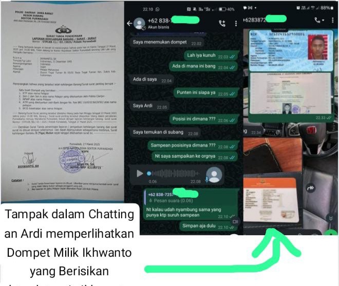 REPORTASEJABAR.COM -Purwadadi, 28 Maret 2025 (GMOCT) – Kasus kehilangan dompet yang dialami Ikhwanto pada Minggu, 23 Maret 2025 lalu, berbuntut panjang dan menimbulkan tanda tanya besar. Kehilangan dompet berisi KTP, SIM A dan C, NPWP, BPJS, ATM, dan STNK (dalam proses) tersebut berujung pada sebuah kisah yang melibatkan seorang supir bus bernama Ardi, dan menimbulkan dugaan penipuan.