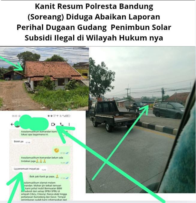 REPORTASEJABAR.COM -Soreang, Jawa Barat 7 April 2025 (GMOCT) – Pada tanggal 27 Maret 2025 Tim liputan gabungan awak media menemukan gudang mencurigakan di wilayah hukum Polresta Bandung Soreang yang diduga menjadi tempat penimbunan solar subsidi ilegal. Informasi tersebut langsung dilaporkan kepada Kanit Resum Polresta Bandung, Dedi, melalui pesan WhatsApp. Namun, tanggapan yang diterima justru menimbulkan pertanyaan besar.