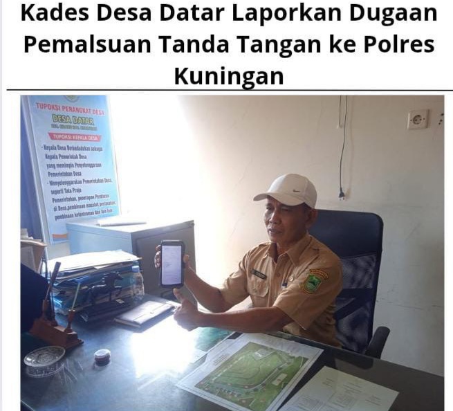 REPORTASEJABAR.COM -Kuningan, Jawa Barat – Wartono, Kepala Desa Datar, Kecamatan Cidahu, Kabupaten Kuningan, berencana melaporkan kasus dugaan pemalsuan tanda tangannya ke Polres Kuningan. Tanda tangan palsu tersebut terdapat pada surat Rekap Permohonan Pencairan Pembebasan Lahan seluas 166.448 m² senilai Rp7.490.160.000,00. Lahan tersebut terletak di Desa Datar dan diajukan oleh PT Intan Mina Abadi, yang beralamat di Jalan Pemuda Kauman, Batang, Cirebon. Informasi ini diperoleh GMOCT (Gabungan Media Online dan Cetak Ternama) dari media online Kabarsbi.com, yang merupakan anggota GMOCT.