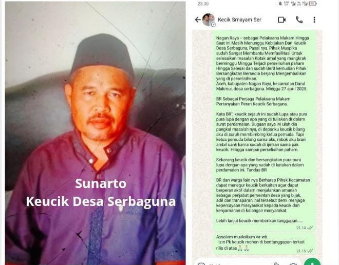 REPORTASEJABAR.COM -Nagan Raya, Aceh (GMOCT) – Sebuah kasus perselisihan terkait kotak amal yang mangkrak di Desa Serbaguna, Kecamatan Darul Makmur, Kabupaten Nagan Raya, Aceh, memasuki babak baru. BR, selaku penjaga dan pelaksana makam, mempertanyakan sikap Keucik (Kepala Desa) yang diduga telah melupakan atau pura-pura melupakan kesepakatan damai yang telah terjalin. Peristiwa ini terjadi pada Minggu, 27 April 2025.