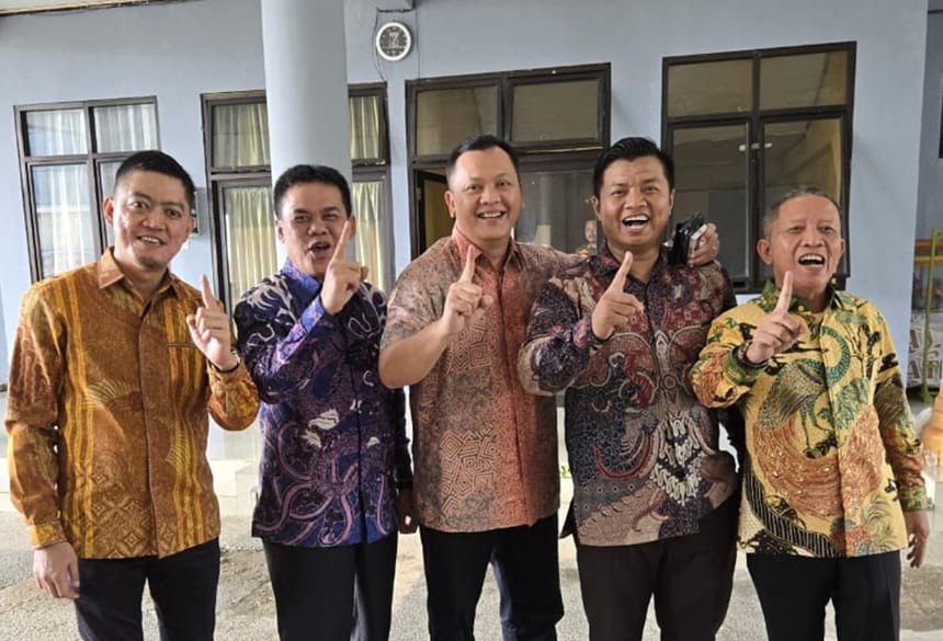 Photo : Tampak Arisandi (Pemenang Pilkada Cabup-Cawabup Pesawaran 2024-2029) mengenakan batik bersama rekannya bersamaan acungkan jari 1 sebagai bentuk dukungan kepada Paslon nomor urut 1 Supriyanto-Suriansyah pada Pilkada Ulang Kabupaten Pesawaran tahun 2025.