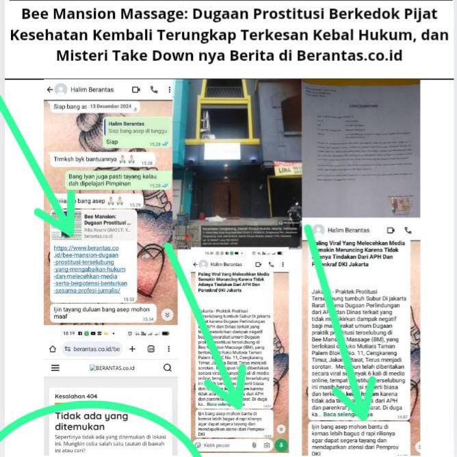 Jakarta, 21 Mei 2025 (GMOCT) – Gabungan Media Online dan Cetak Ternama (GMOCT), yang beranggotakan puluhan media online dan cetak ternama, kembali menyoroti dugaan praktik prostitusi di Bee Mansion Massage, Jakarta Barat. Ini merupakan pemberitaan keempat kalinya terkait Bee Mansion sejak November 2024, menunjukkan adanya dugaan praktik yang terus berlangsung. Menariknya, Berantas.co.id, salah satu media online yang sebelumnya aktif memberitakan kasus ini dan yang memberikan informasi dan data kepada GMOCT serta sempat tergabung dalam GMOCT, kini diduga telah “damai” dengan Bee Mansion dan menghapus pemberitaan terkait.