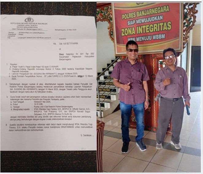 REPORTASEJABAR.COM ‘Banjarnegara, 27 Mei 2025 (GMOCT) – Aji Setiawan Andika, terlapor kasus dugaan ujaran kebencian di Banjarnegara, memenuhi panggilan klarifikasi Unit II Reskrim Polres Banjarnegara pada Selasa (27/5). Ia didampingi pengacaranya dari DPC Ikadin Banjarnegara. Aji membantah tuduhan menyebarkan ujaran kebencian yang dilaporkan oleh Sugeng, seorang relawan dari Wanayasa pada 14 Februari 2025 lalu. Laporan tersebut mengacu pada Pasal 28 ayat (2) UU 1/2024 tentang Informasi dan Transaksi Elektronik (ITE).