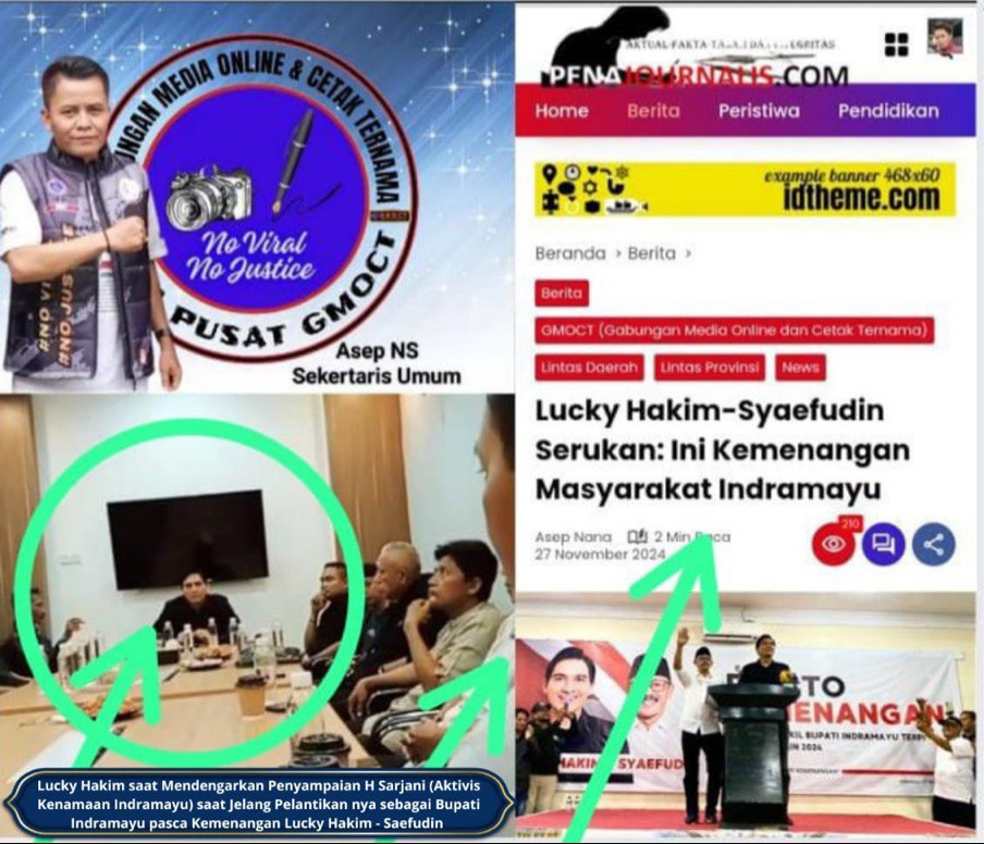 Dengan link lengkap, https://penajournalis.com/lucky-hakim-syaefudin-serukan-ini-kemenangan-masyarakat-indramayu/, menyampaikan bahwa, “kami pernah menayangkan pemberitaan terkait kemenangan Lucky Hakim – Saefudin sebagai Bupati dan wakil Bupati Indramayu, janganlah ucapan-ucapan mereka kemenangan ini adalah kemenangan untuk rakyat Indramayu, dan jangan seperti Tebu yang Di Met Manise Bae, dan dibuang setelah jadi ampas”.