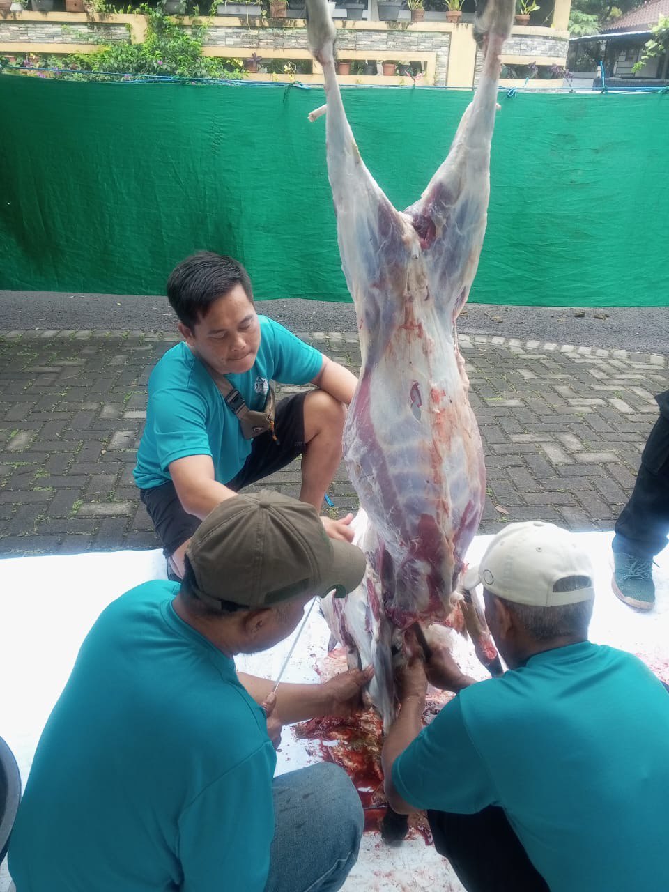 “Alhamdulillah kami selaku panitia Qurban Idul Adha 1446 H mengurbankan 10 ekor sapi terdiri dari  sapi type A 400 kg sebanyak 2 ekor dan 5 ekor sapi type B dan 1 ekor sapi Limosin type B berbobot  masing-masing 300 kg, sapi type c  dan sapi perah type D berbobot sama-sama 200 kg serta 4 ekor kambing “ujar Pak Sukirno selaku ketua panitia Idul Adha 1446 H.
