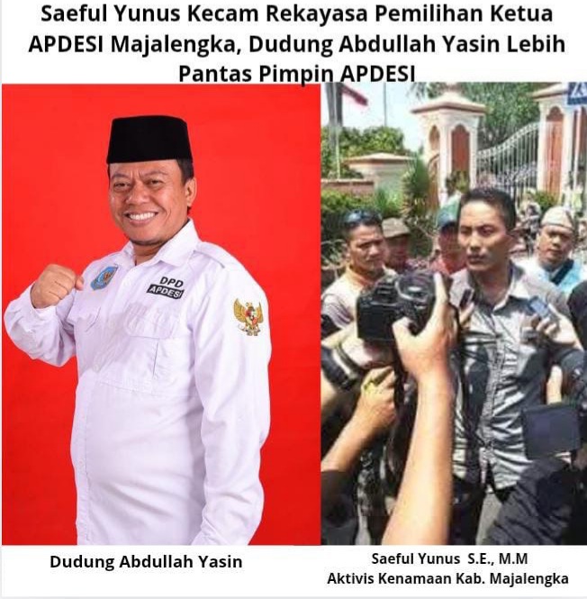 REPORTASEJABAR.COM -Majalengka, 11 Juni 2025 (GMOCT) – Saeful Yunus, S.E., M.M., mengutuk keras dugaan kuat rekayasa dan pengkondisian dalam pemilihan Ketua APDESI Kabupaten Majalengka. Ia menyoroti bahwa hanya ketua forum kepala desa dari 26 kecamatan yang diundang, dengan masing-masing hanya memiliki satu hak pilih.