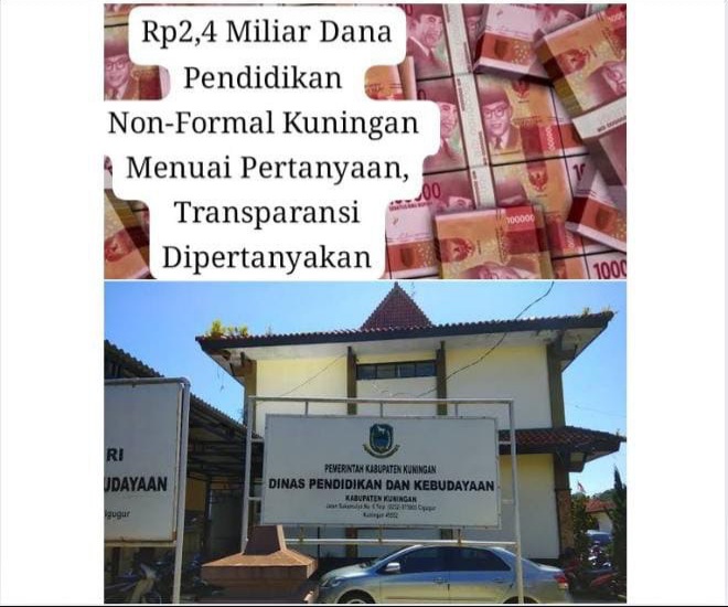 REPORTASEJABAR.COM -Kuningan, Jawa Barat (GMOCT) 25 Juni 2025 – Pencairan dana sebesar Rp2,4 miliar yang dialokasikan untuk sektor pendidikan non-formal di Kabupaten Kuningan menimbulkan pertanyaan publik. Meskipun Dinas Pendidikan dan Kebudayaan (Disdik) Kabupaten Kuningan mengklaim pencairan dana dengan kode rekening 2.04.0016 telah sesuai prosedur dan tercatat dalam APBD, ketidakjelasan alur penyaluran dana tersebut memicu sorotan.