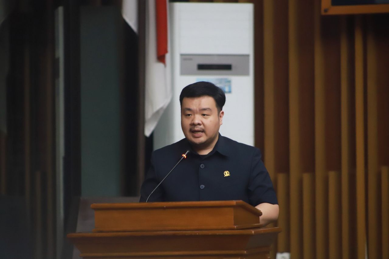 Wakil Ketua Fraksi PSI DPRD Kota Bandung Christian Julianto Budiman menyampaikan pandangan umum terkait Raperda Perubahan APBD 2025, dalam Rapat Paripurna di Gedung DPRD Kota Bandung, Jumat, 4 Juli 2025.