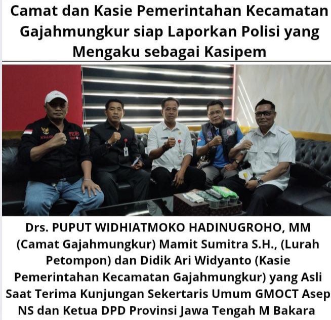 Tepatnya pada Rabu 9 Juli 2025 team liputan khusus GMOCT diundang oleh Camat Gajahmungkur Drs. PUPUT WIDHIATMOKO HADINUGROHO, MM, yang dihadiri juga Lurah Petompon Mamit Sumitra S.H, dan Kasipem (Kasie Pemerintahan) Didik Ari Widyanto yang mana saat pertemuan tersebut team liputan mencoba menghubungi no kontak oknum yang mengaku sebagai Kasie Pemerintahan tersebut dan menjawab bahwa dia sedang tugas luar, padahal Kasie Pemerintahan Kecamatan Gajahmungkur yang Asli sedang bersama team liputan dan juga Camat serta Lurah Petompon mendengarkan percakapan telepon antara team liputan dengan orang yang mengaku sebagai Kasie Pemerintahan tersebut.