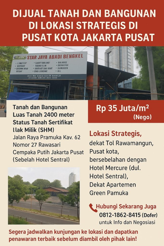 Apakah Anda sedang mencari properti strategis untuk investasi jangka panjang atau pengembangan bisnis di Jakarta Pusat? Kini hadir kesempatan langka: Tanah dan Bangunan seluas 2.400 m² dengan Sertifikat Hak Milik (SHM) yang terletak di lokasi emas — tepat di jantung kota Jakarta!