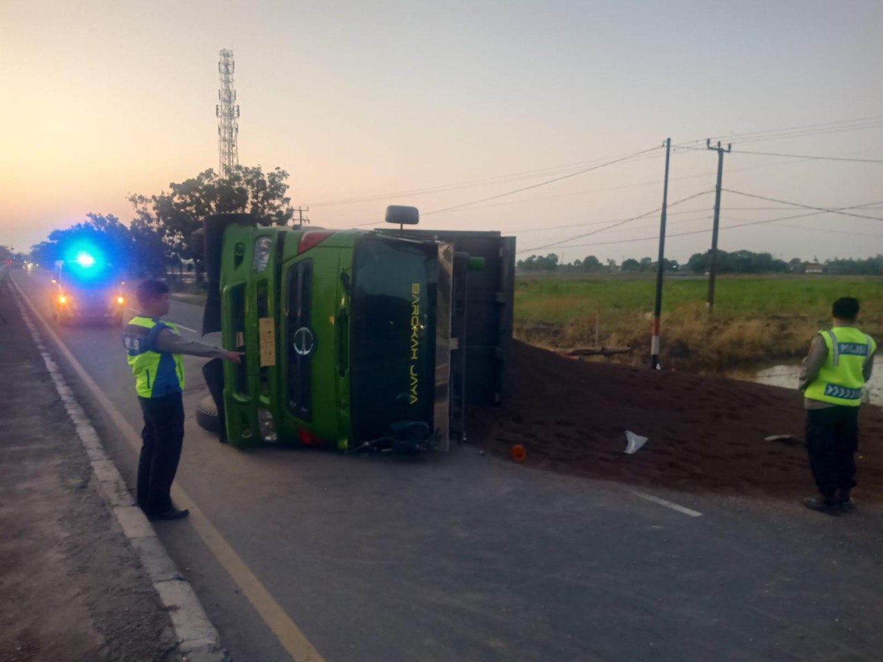 Polisi Evakuasi Truk Tronton Terguling di Kandanghaur Indramayu, Muatan Pasir Tumpah ke Jalan