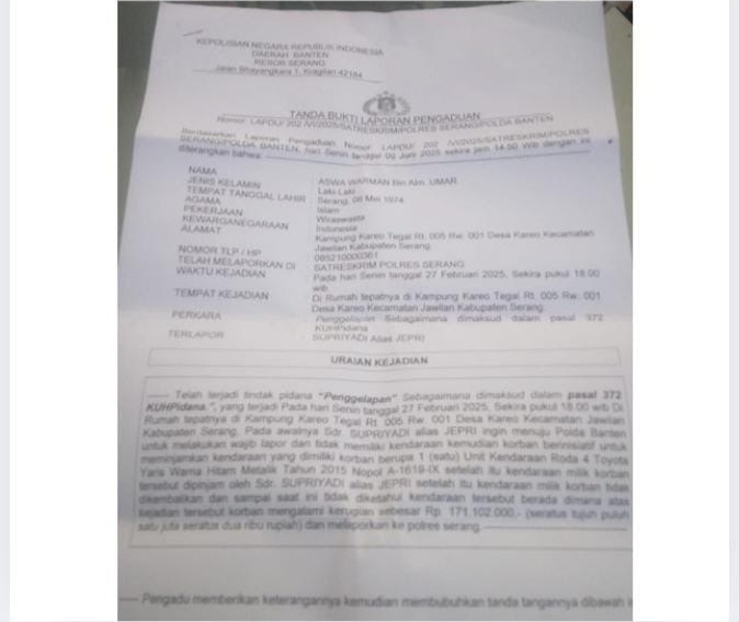 REPORTASEJABAR.COM -Serang (GMOCT) 19 Agustus 2025 – Aswa, seorang warga Kampung Kareo, Desa Kareo, Kecamatan Jawilan, Kabupaten Serang, diduga menjadi korban penggelapan yang dilakukan oleh temannya sendiri berinisial JPR. Informasi ini didapatkan oleh GMOCT Gabungan Media Online dan Cetak Ternama dari media online Katatribun.id yang juga tergabung dalam GMOCT.