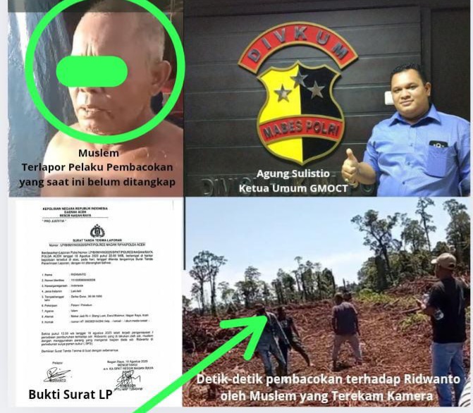 REPORTASEJABAR.COM -Nagan Raya (GMOCT) 20 Agustus 2025 – Kasus pembacokan terhadap Ketua DPD GMOCT Provinsi Aceh, Ridwanto, hingga kini belum menemui titik terang, memicu dugaan adanya permainan kotor dalam penegakan hukum di Kabupaten Nagan Raya. Laporan resmi telah dibuat ke Polres Nagan Raya, namun pelaku yang identitasnya disebut-sebut sudah diketahui, masih bebas berkeliaran.