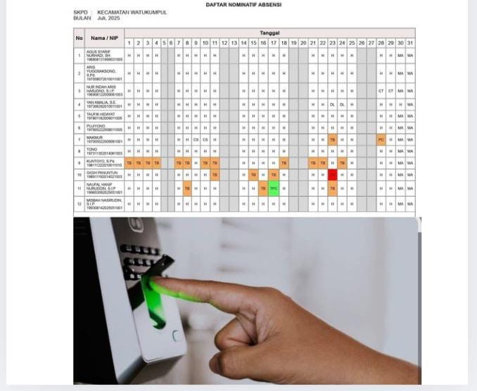 REPORTASEJABAR.COM -PEMALANG, JAWA TENGAH (GMOCT) 22 Agustus 2025 – Dugaan kecurangan dalam absensi elektronik (E-Presensi) kembali mencoreng dunia birokrasi. Kali ini, oknum Aparatur Sipil Negara (ASN) berinisial KY, yang bekerja di lingkungan Kecamatan Watu Kumpul, Kabupaten Pemalang, Jawa Tengah, diduga tidak melakukan E-Presensi dengan jari sendiri, melainkan menggunakan jari orang lain. Informasi ini diperoleh GMOCT (Gabungan Media Online dan Cetak Ternama) dari media online Kabarsbi, yang juga tergabung dalam GMOCT.