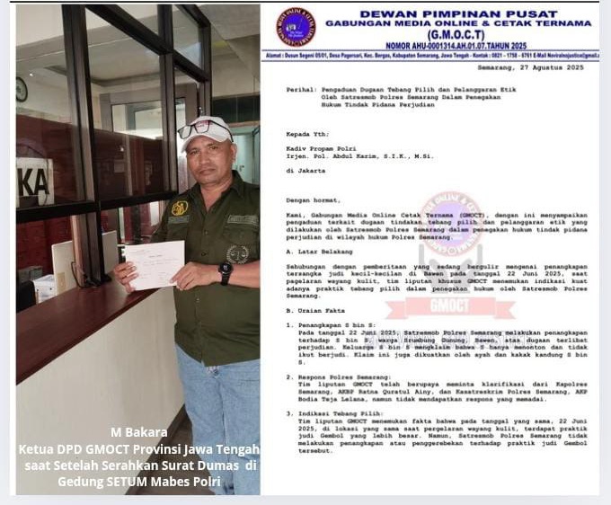 REPORTASEJABAR.COM -Jakarta (GMOCT) 27 Agustus 2025 – Gabungan Media Online Cetak Ternama (GMOCT) secara resmi menyampaikan pengaduan kepada Divisi Profesi dan Pengamanan (Propam) Polri terkait dugaan tindakan tebang pilih dan pelanggaran etik yang dilakukan oleh Satresmob Polres Semarang dalam penegakan hukum tindak pidana perjudian. Pengaduan ini diajukan pada hari Rabu, 27 Agustus 2025, di Sekretariat Umum (SETUM) Propam Presisi Mabes Polri, Jakarta.