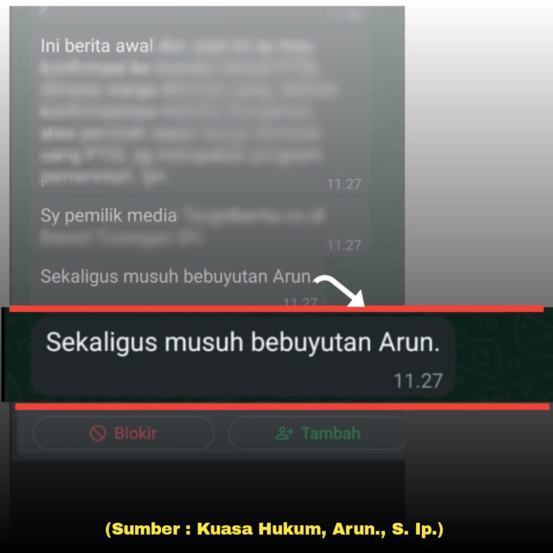Saat ini Noven Saputera,S.H. Kuasa Hukum dari saudara Arun,S.Ip kembali mengungkapkan telah ditemukan lagi satu kejanggalan dimana menyebutkan dalam bukti chat yang secara otomatis pengakuan atas dirinya sendiri bahwa beliau atau diduga salah satu aktor dari serangan pemberitaan yang dimuat yang tentunya memojokan Klien kami tersebut menyebutkan Kades Arun,S.Ip merupakan Musuh Bebuyutannya.