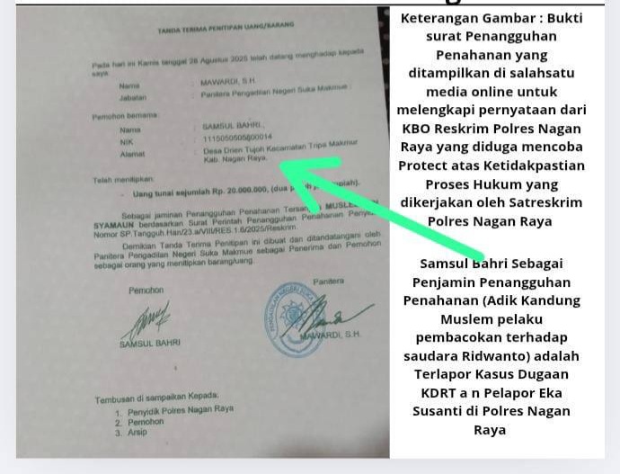 “Kami sendiri memiliki rekaman suara salah satu Penyidik Reskrim Polres Nagan Raya yang menangani kasus pembacokan terhadap saudara Ridwanto yang menyebutkan apabila Samsul Bahri selaku penjamin penangguhan penahanan telah ditetapkan sebagai tersangka oleh PPA Polres Nagan Raya, maka secara otomatis Penangguhan Penahanannya akan dibatalkan dan Muslem akan segera ditahan, namun informasi yang beredar diduga Muslem belum ditangkap, kendati Sie Humas Polres Nagan Raya telah menyebutkan bahwa intinya pelaku (Muslem) sudah ditahan, meskipun baik Sie Humas Polres Nagan Raya ataupun penyidik tidak pernah memperlihatkan bukti ditahannya pelaku pembacokan terhadap saudara Ridwanto.”