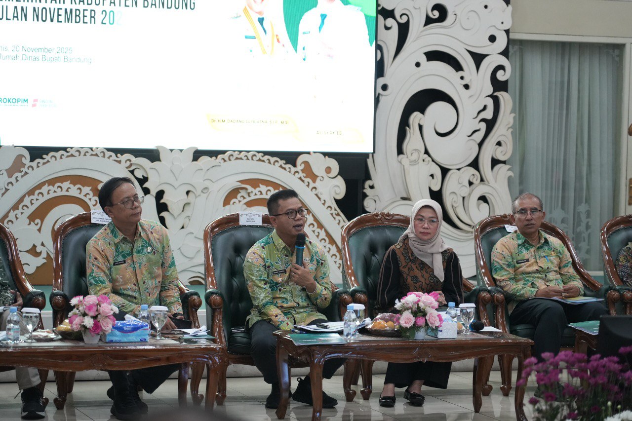 KABUPATEN BANDUNG Reportasejabar.com Bupati Bandung, Dadang Supriatna menekankan pentingnya stabilitas fiskal dan penguatan kinerja pendapatan daerah pada Rapat Koordinasi Bulanan Pemerintah Kabupaten Bandung yang digelar di Rumah Dinas Bupati Bandung, Kamis (20/11). Seluruh pimpinan perangkat daerah, camat, dan direktur RSUD se-Kabupaten Bandung hadir dalam agenda tersebut.